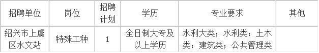 因工作需要,绍兴市上虞区水利局下属事业单位上虞区水文站计划在上虞区范围内公开招聘编外工作人员1名,现将有关事项公告如下: