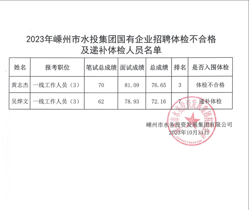 嵊州市水投集团国有企业招聘体检不合格及递补体检人员名单