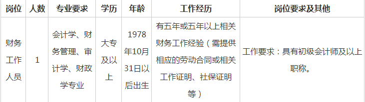 本次面向社会招聘财务工作人员1名,具体岗位、招聘人数、资格条件如下: