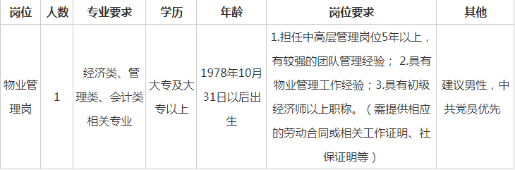 本次面向社会招聘物业管理工作人员1名,具体岗位、招聘人数、资格条件如下: