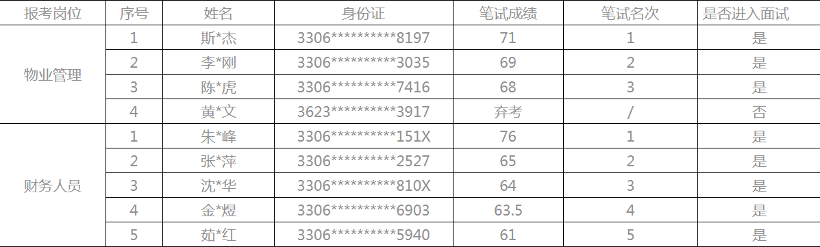 根据2023年11月28日和12月5日发布的《绍兴迪荡物业管理有限公司》招聘公告,现将参考人员笔试成绩公示如下: