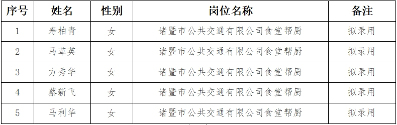 根据2023年12月5日发布的食堂帮厨招聘公告,经过公开报名、面谈等环节,确定拟录用人员5,现予以公示,征求广大干部群众的意见,有关事项通告如下: