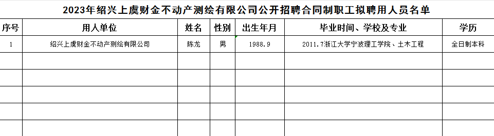 据《绍兴上虞财金不动产测绘有限公司合同制职工公开招聘公告》规定,经过岗位胜任力测评、笔试、面试、体检、考察等环节,考生陈龙符合条件,作为拟录用人员,现将该名考生的基本情况予以公示: