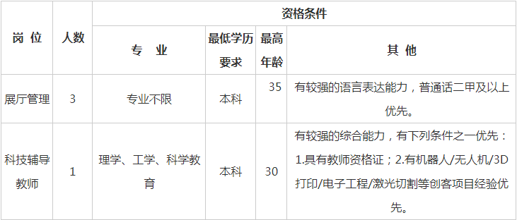 3.具有国家承认的国民教育系列学历,学历为与专业对应的起点学历,含其以上学历。专业按毕业证书标注确定,第二专业(辅修专业)认定以教育部学生信息网查实的名称为准。展厅管理岗位要求年龄在35周岁及以下(1987年12月28日以后出生),科技辅导教师岗位要求年龄在30周岁及以下(1992年12月28日以后出生)具体按报考要求;