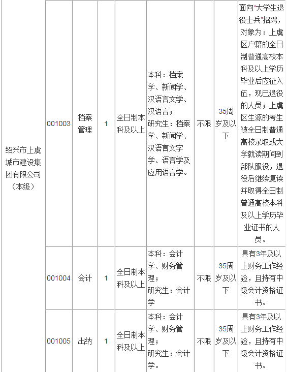 3.报考须知:报名者每人限报一个岗位,请随带近期一寸免冠彩照1张、户口簿或户籍证明、身份证、毕业证书原件及复印件各一份,并提供《教育部学历证书电子注册备案表》、《教育部学籍在线验证报告》各一份,留学人员应提供教育部中国留学服务中心出具的境外学历、学位认证书;有工作经验规定的,需提供社保缴费证明(历年参保证明)及单位从业证明(或能体现岗位的劳动合同);有其他特殊规定的,需提供相关职称资格证书等,同时提交《绍兴市上虞城市建设集团有限公司公开招聘合同制职工报名表》、《承诺书》一份(见附件,由考生自行下载并填写)。