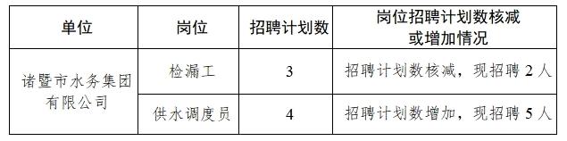 根据《2024年度诸暨市水务集团有限公司招聘公告》,对通过资格初审人数低于招聘计划数3倍的岗位,核减招聘计划数,同时“对核减的计划招聘人数,在‘供水调度员’岗位招聘数中增加相应人数”。现将有关岗位招聘计划数核减或增加情况予以公告,其余岗位招聘计划不变。