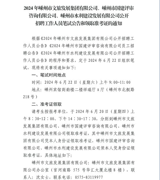 | 2024年嵊州市文旅发展集团有限公司、嵊州市国建评审咨询有限公司、嵊州市水利建设发展有限公司公开招聘工作人员笔试公告和领取准考证的通知 |