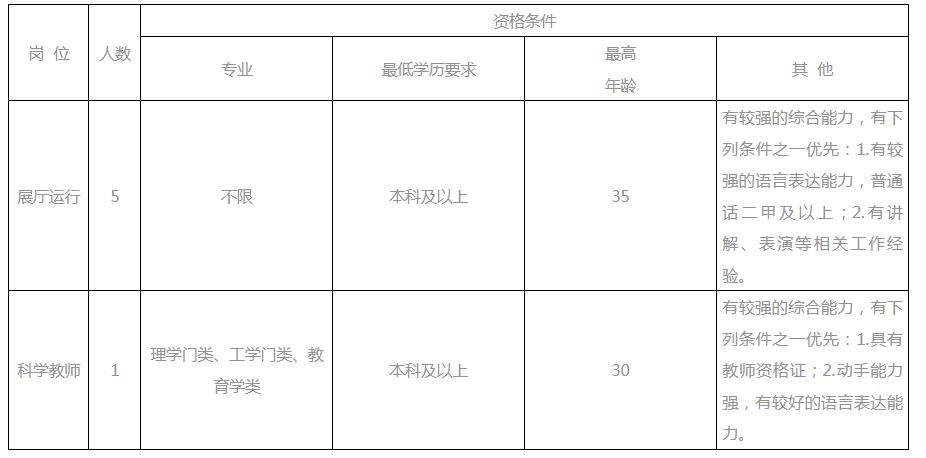 3.具有国家承认的国民教育系列学历,学历为与专业对应的起点学历,含其以上学历。专业按毕业证书标注确定,第二专业(辅修专业)认定以教育部学生信息网查实的名称为准。展厅运行岗要求年龄在35周岁及以下(1988年8月8日以后出生),科技教师岗要求年龄在30周岁及以下(1993年8月8日以后出生);