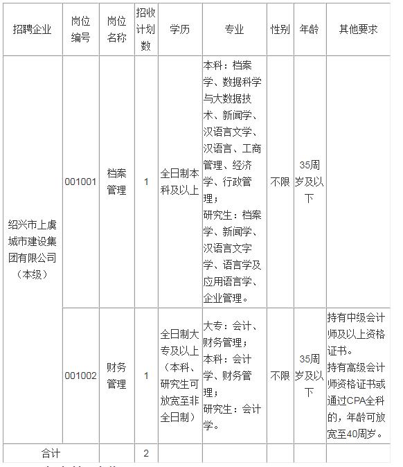 绍兴市上虞城市建设集团有限公司是经区政府批准成立的国有企业。因经营业务发展需要,现面向社会公开招聘2名合同制职工。有关事项公告如下: