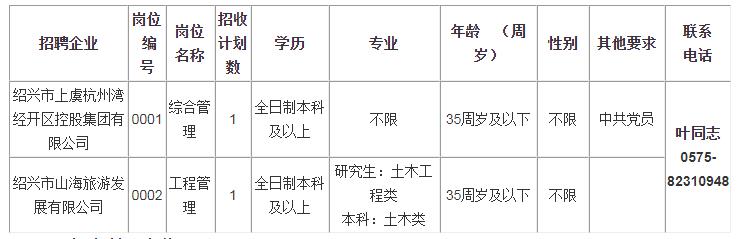 为满足企业发展需要,绍兴市上虞杭州湾经开区控股集团有限公司现面向社会公开招聘2名合同制职工。具体招聘事项公告如下: