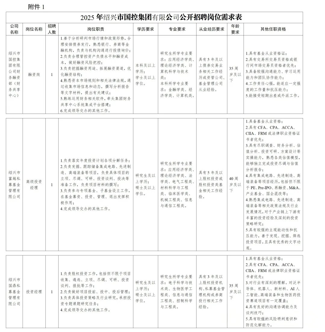 本次面向社会发布岗位3个,具体为绍兴市国控集团有限公司财务融资部(财务共享中心)融资岗1人,绍兴市富越私募基金管理有限公司高级投资经理1人,绍兴市国鼎私募基金管理有限公司投资经理1人。具体岗位及资格条件等详见《2025年绍兴市国控集团有限公司公开招聘岗位需求表》(附件1)。