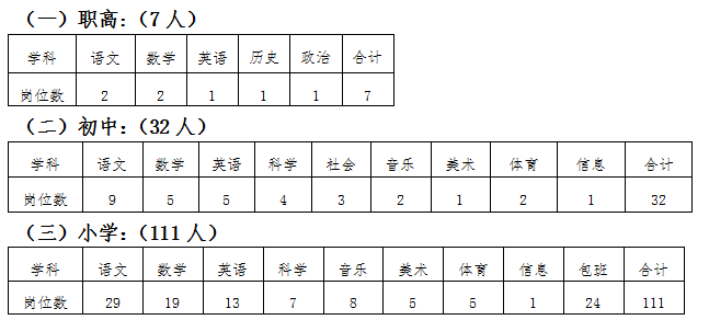 招聘中小学储备教师150名,具体招聘学校根据中小学实际需求情况和在职教师调配情况在自主择岗前公布。相关岗位计划数如下: