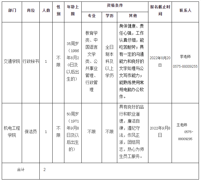 学校现有梅山、镜湖两个校区,占地面积912亩,拥有全日制在校生15000余人。现设机电工程学院、建筑工程学院、财经学院、商贸学院、交通学院、设计与艺术学院(腾讯云国际互联网学院)、鉴湖学院(纺织学院、黄酒学院、健康学院)、公共基础教学部部(马克思主义学院、体育部)等二级学院(部)。开设机电一体化技术、工程造价等48个专业。为适应学校进一步发展的需要,现面向社会公开招聘工作人员2名,用工性质为编制外合同工(劳务派遣)。