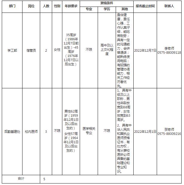 学校现有梅山、镜湖两个校区,占地面积912亩,拥有全日制在校生15000余人。现设机电工程学院、建筑工程学院、财经学院、商贸学院、交通学院、设计与艺术学院(腾讯云国际互联网学院)、鉴湖学院(纺织学院、黄酒学院、健康学院)、公共基础教学部部(马克思主义学院、体育部)等二级学院(部)。开设机电一体化技术、工程造价等48个专业。为适应学校进一步发展的需要,现面向社会公开招聘工作人员5名,用工性质为编制外合同工(劳务派遣)。