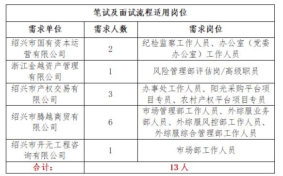 笔试流程仅适用于以下岗位:绍兴市国有资本运营有限公司纪检监察工作人员、办公室(党委办公室)工作人员,浙江金越资产管理有限公司风险管理部评估岗/高级职员,绍兴市产权交易有限公司办事处工作人员、阳光采购平台项目专员、农村产权平台项目专员,绍兴市腾越商贸有限公司所有岗位,绍兴市开元工程咨询有限公司市场部工作人员。