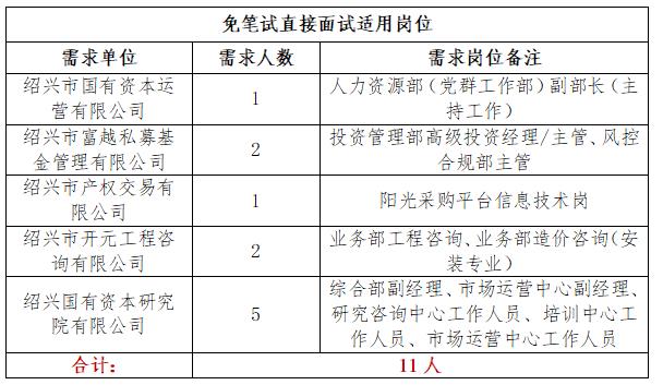 以下岗位免笔试直接进行面试流程:绍兴市国有资本运营有限公司人力资源部(党群工作部)副部长(主持工作),绍兴市富越私募基金管理有限公司投资管理部高级投资经理/主管、风控合规部主管,绍兴市产权交易有限公司阳光采购平台信息技术岗,绍兴市开元工程咨询有限公司业务部工程咨询、业务部造价咨询(安装专业),绍兴国有资本研究院有限公司所有岗位。